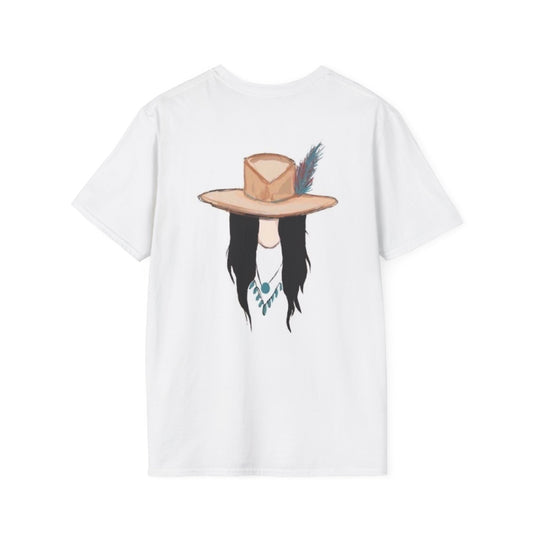 Boho Chic Graphic T-Shirt - Women’s Unisex Softstyle Tee with Feathered Hat Design